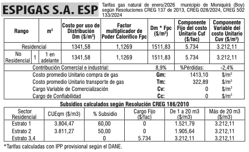 ESPIGAS, es la empresa distribuidora en el Municipio de Moniquirá - Boyacá, por esto a continuación encontrarás las tarifas vigentes del mes en dicha localidad.